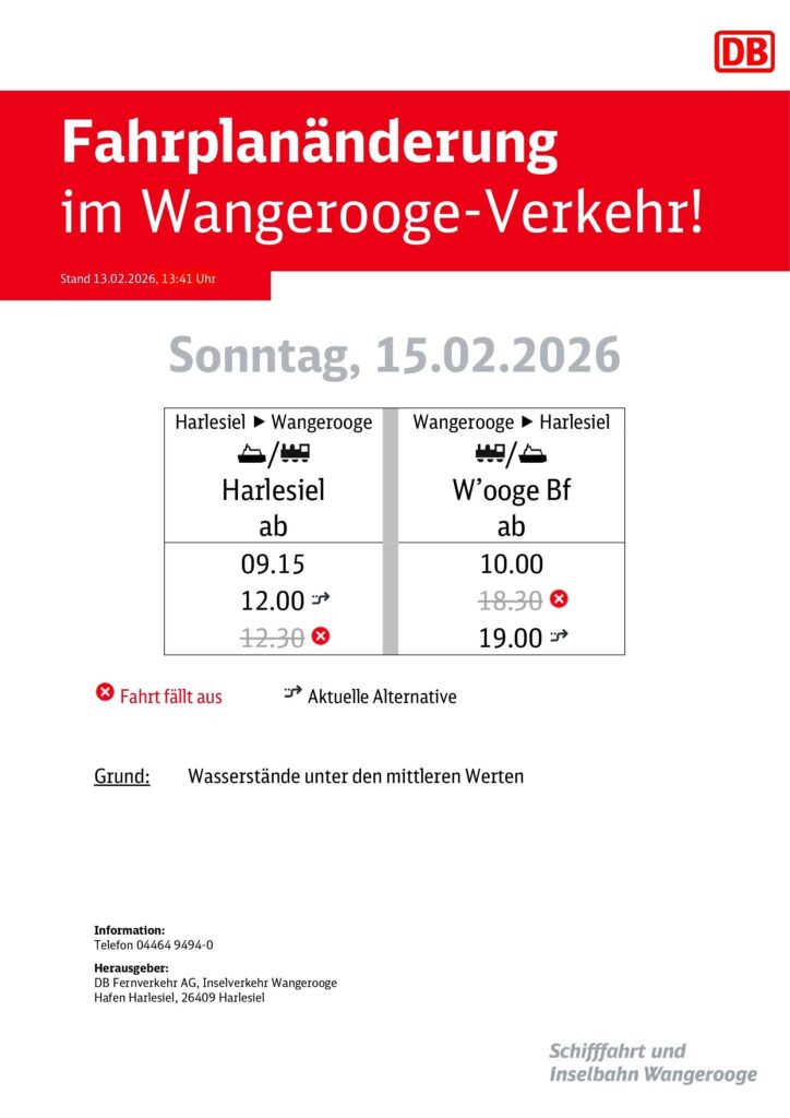 Aufgrund gemeldeter Wasserstände, unter den mittleren Werten, kommt es am Sonntag, den 15.02.2026 zu Fahrplanänderungen im Verkehr von und zur Insel Wangerooge. Die Abfahrtzeiten für So, 15.02.2026 ab Harlesiel: 9:15 und 12:00 Uhr ab Bahnhof Wangerooge: 10:00 und 19:00 Uhr