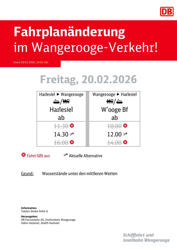 Aufgrund gemeldeter Wasserstände, unter den mittleren Werten kommt es am Donnerstag, den 19.02.2026 und Freitag, den 20.02.2026 zu Fahrplanänderungen im Verkehr von und zur Insel Wangerooge. Die neuen Abfahrtzeiten Do, 19.02.2026 ab Harlesiel um 11:15 und 14:15 Uhr ab Bahnhof Wangerooge um 12:00 Uhr Fr, 20.02.2026 ab Bahnhof Wangerooge um 12:00 Uhr ab Harlesiel um 14:30 Uhr