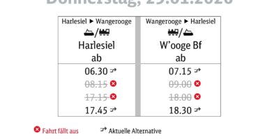 Aufgrund gemeldeter Wasserstände, unter den mittleren Werten, kommt es am Donnerstag, den 29.01.2026 zu Fahrplanänderungen im Verkehr von und zur Insel Wangerooge. Die neuen Abfahrten für Do, 29.01.2026 ab Bahnhof Wangerooge: 7:15 und 18:30 Uhr ab Harlesiel: 6:30 und 17:45 Uhr