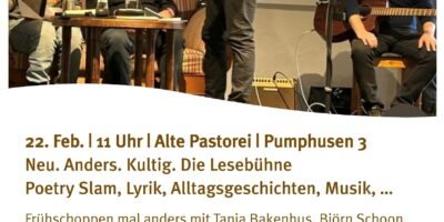 Am Sonntag, 22. Februar um 11 Uhr startet die Lesebühne am Deutschen Sielhafenmuseum in der Sielscheune der Alten Pastorei in die neue Saison. Zeitlich und räumlich „achter‘t Kark“ kann man endlich mal wieder schön frühschoppen und sich dabei mindestens einen Satz heißer Ohren abholen! In der Alten Pastorei in Carolinensiel wird bei lockerer Moderation gedichtet, geslamt und Alltagsgeschichten unterhaltsam verpackt. Das Ganze wird musikalisch untermalt von Frank Brüling auf seiner…