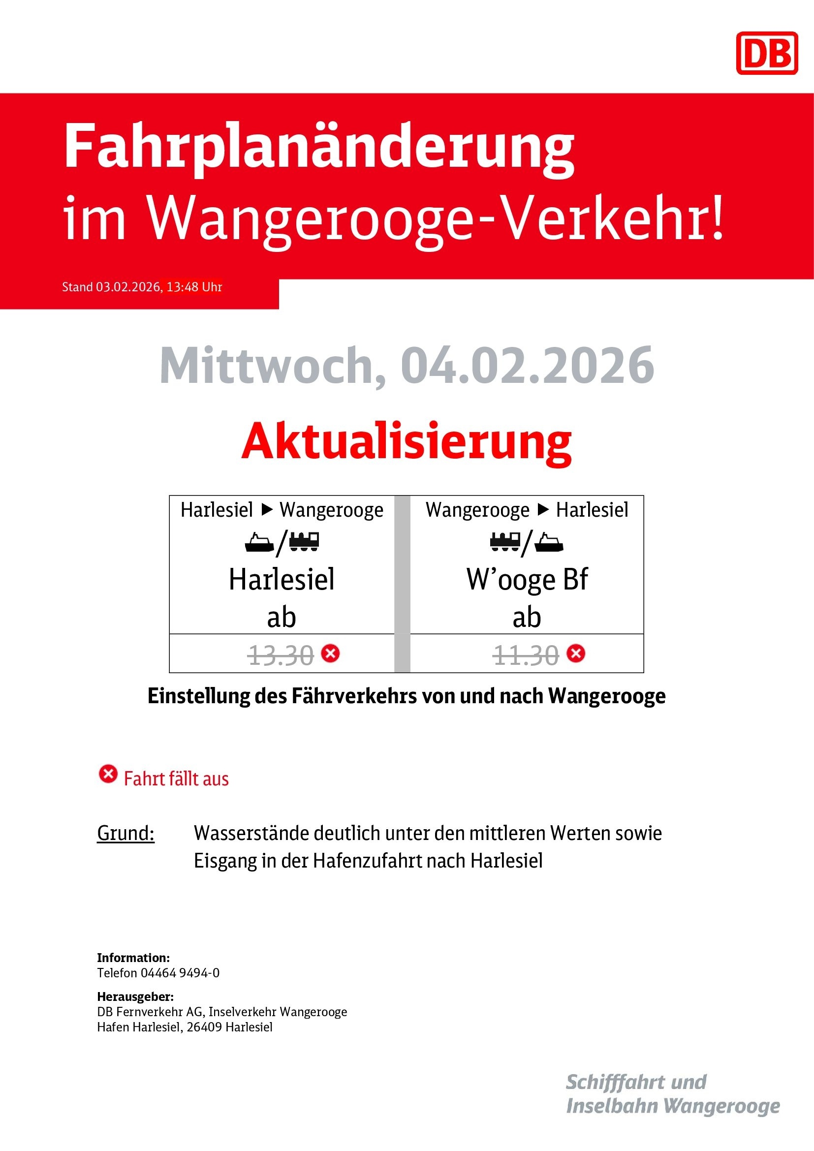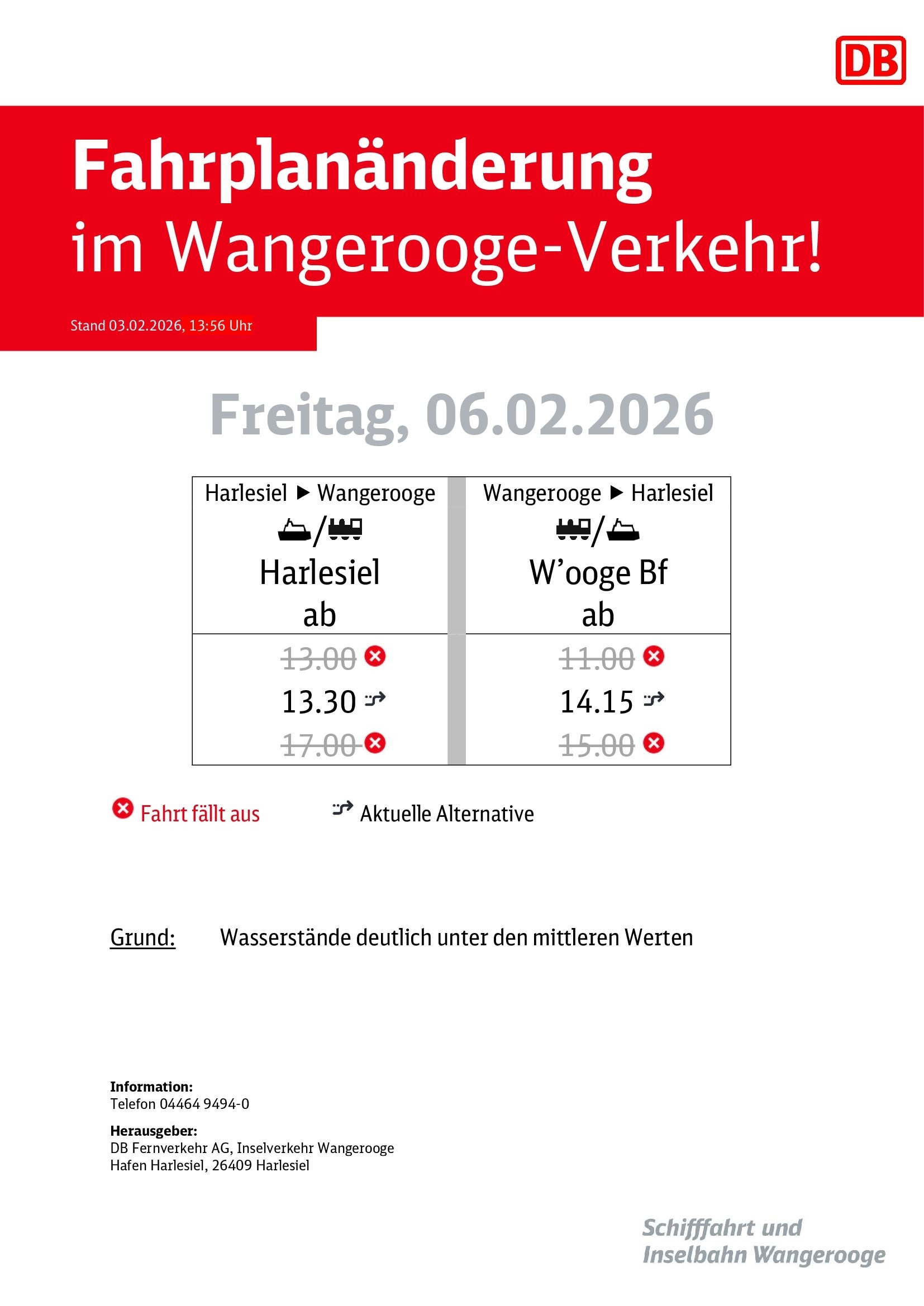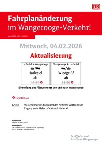 Aufgrund der geringen Wasserstände und hinzukommendem Eisgang in der Hafenzufahrt nach Harlesiel, wird der Fährverkehr am Mittwoch, den 04.02.2026 und Donnerstag, den 05.02.2026 eingestellt.