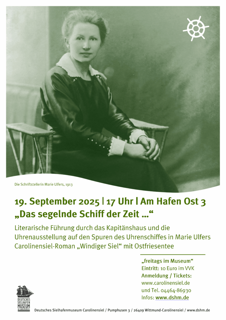 Literarische Führung mit Marie Ulfers Roman „Windiger Siel“ zu den Uhrenschiffchen in den friesischen Uhren Am Freitag, 19. September um 17 Uhr bietet Museumsleiterin Dr. Heike Ritter-Eden im Rahmen der Sonderausstellung „Zeitlos!“ eine Führung durch das Kapitänshaus des Deutschen Sielhafenmuseums in Carolinensiel an und geht dabei besonders auf die Bedeutung der friesischen Halbkastenuhr in den Carolinensieler Schifferfamilien ein. Immer wieder beschreibt die Carolinensieler Heimatschriftstellerin Marie Ulfers (1888-1960) in ihrem Roman…