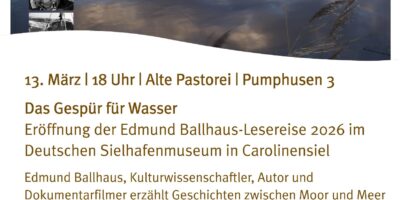 Lesung von Edmund Ballhaus im Deutschen Sielhafenmuseum Am Freitag, 13.03. um 18 Uhr eröffnet Edmund Ballhaus die Lesereise 2026 zu seinem neuesten Werk „Das Gespür für Wasser“ in der Sielscheune des Deutschen Sielhafenmuseums in Carolinensiel. „Sie würden also schmecken, ob Ihr Tee mit dem Wasser aus einem Torfbrunnen gebrüht wurde?“ – mit dieser staunenden Frage beginnt eine Begegnung, die Edmund Ballhaus in seinem Buch festhält und die offenbart, wie tief…