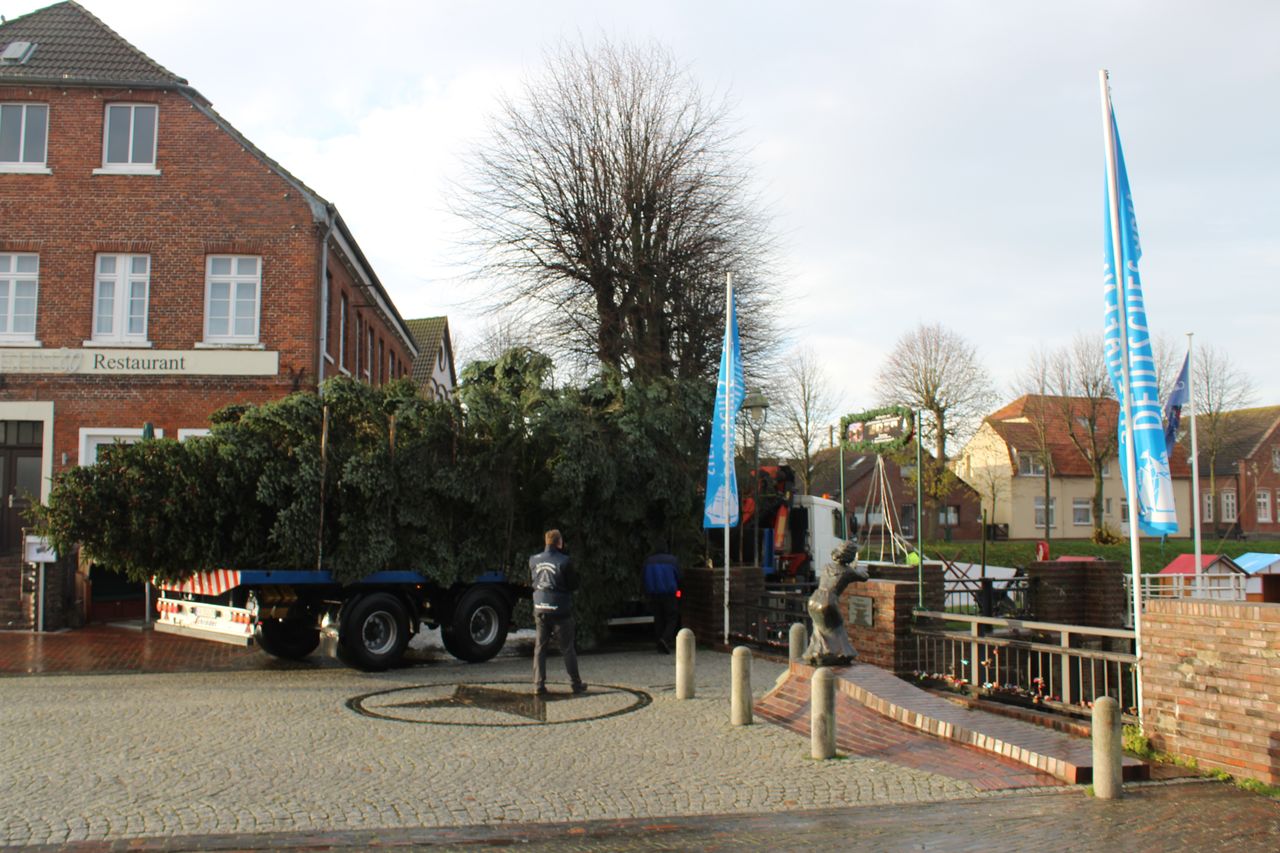 Jetzt wartet der Baum in Museumshafen auf die Mannschaft die die Lichterketten anbringt.