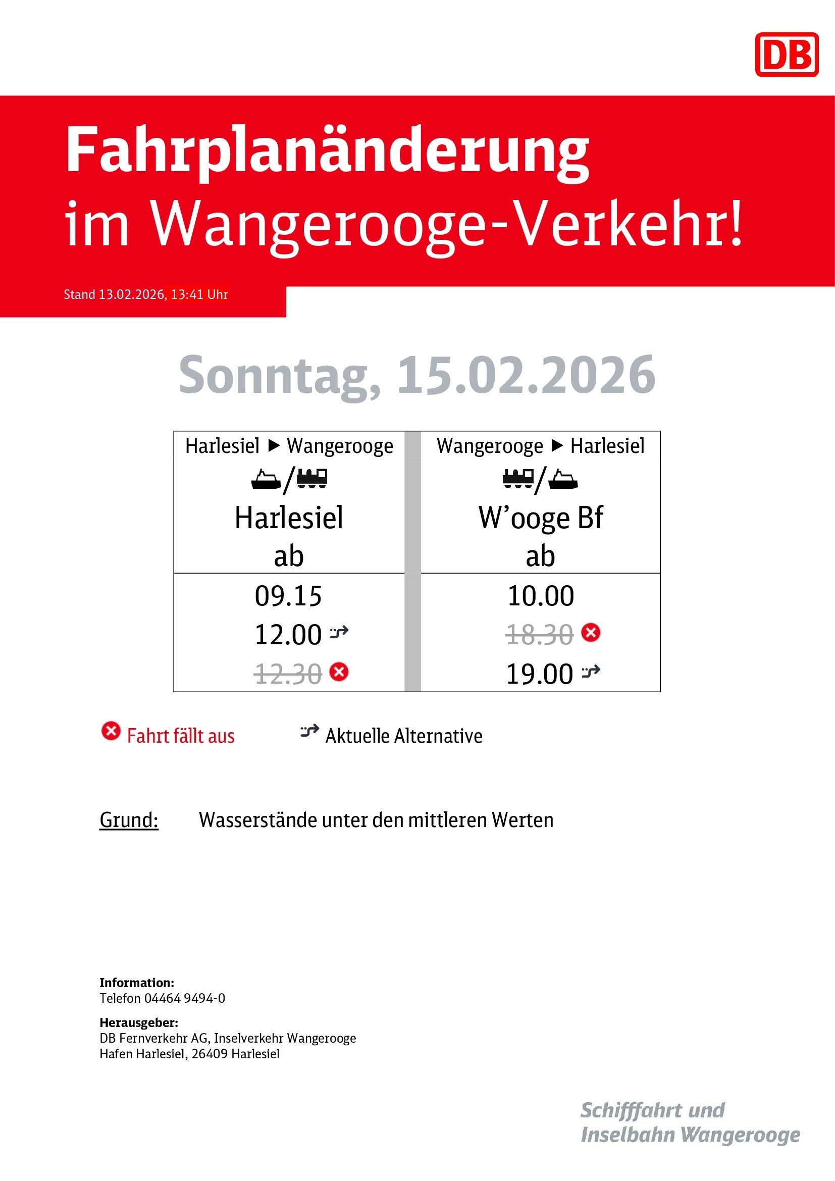 Aufgrund gemeldeter Wasserstände, unter den mittleren Werten, kommt es am Sonntag, den 15.02.2026 zu Fahrplanänderungen im Verkehr von und zur Insel Wangerooge.