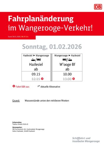 Aufgrund der anhaltenden Ostwindlage mit Wasserstandsvorhersagen, unter den mittleren Werten, kommt es im Zeitraum vom Samstag, den 31.01.2026 bis einschl. Montag, den 02.02.2026 zu Fahrplanänderungen im Verkehr von und zur Insel Wangerooge.