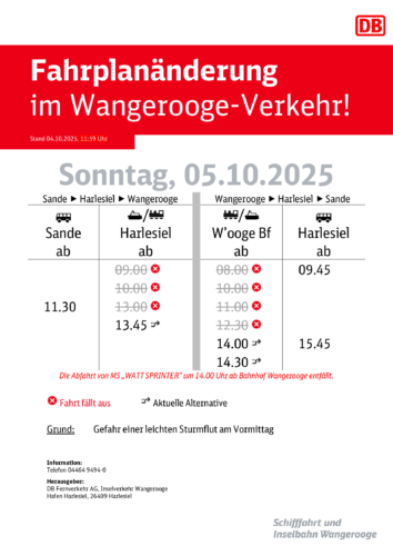 Aufgrund der Warnung vor einer leichten Sturmflut, sowie der Schließung des Deichtores auf Wangerooge vom Samstagabend bis zum morgigen Mittag kommt es am Sonntag, den 05.10.2025 zu Fahrplanänderungen im Verkehr von und zur Insel Wangerooge.