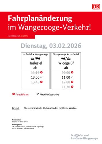 Aufgrund der Ostwindlage, mit deutlich geringeren Wasserständen, kommt es bis einschließlich Donnerstag, den 05.02.2026 zu Fahrplanänderung im Verkehr von und nach Wangerooge.