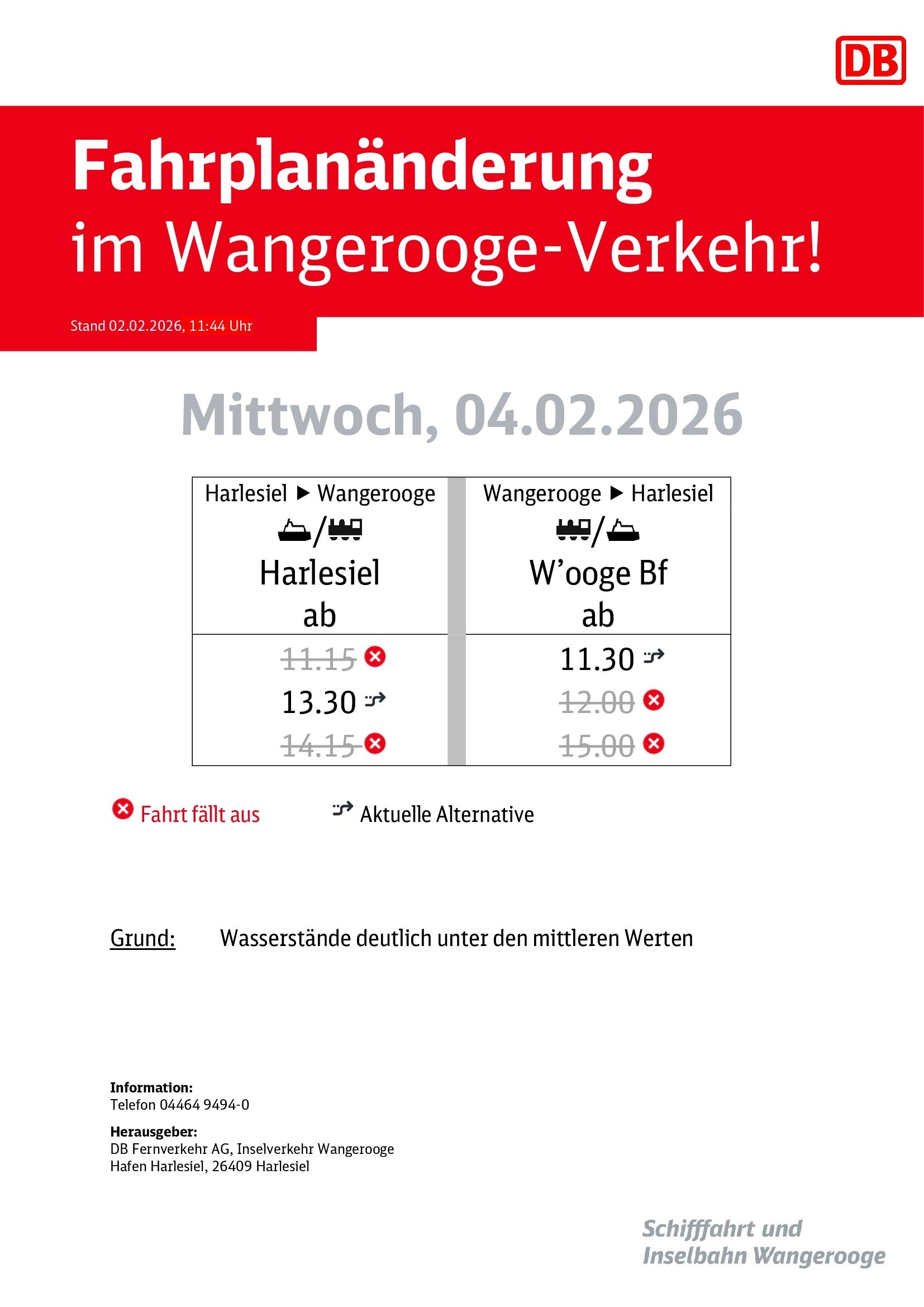 Aufgrund der Ostwindlage, mit deutlich geringeren Wasserständen, kommt es bis einschließlich Donnerstag, den 05.02.2026 zu Fahrplanänderung im Verkehr von und nach Wangerooge.