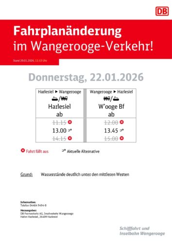Aufgrund gemeldeter Wasserstände, die deutlich unter den mittleren Werten liegen werden, kommt es vom morgigen Mittwoch, den 21.01.2026 bis einschließlich Samstag, den 24.01.2026 zu Fahrplanänderungen im Verkehr von und nach Wangerooge