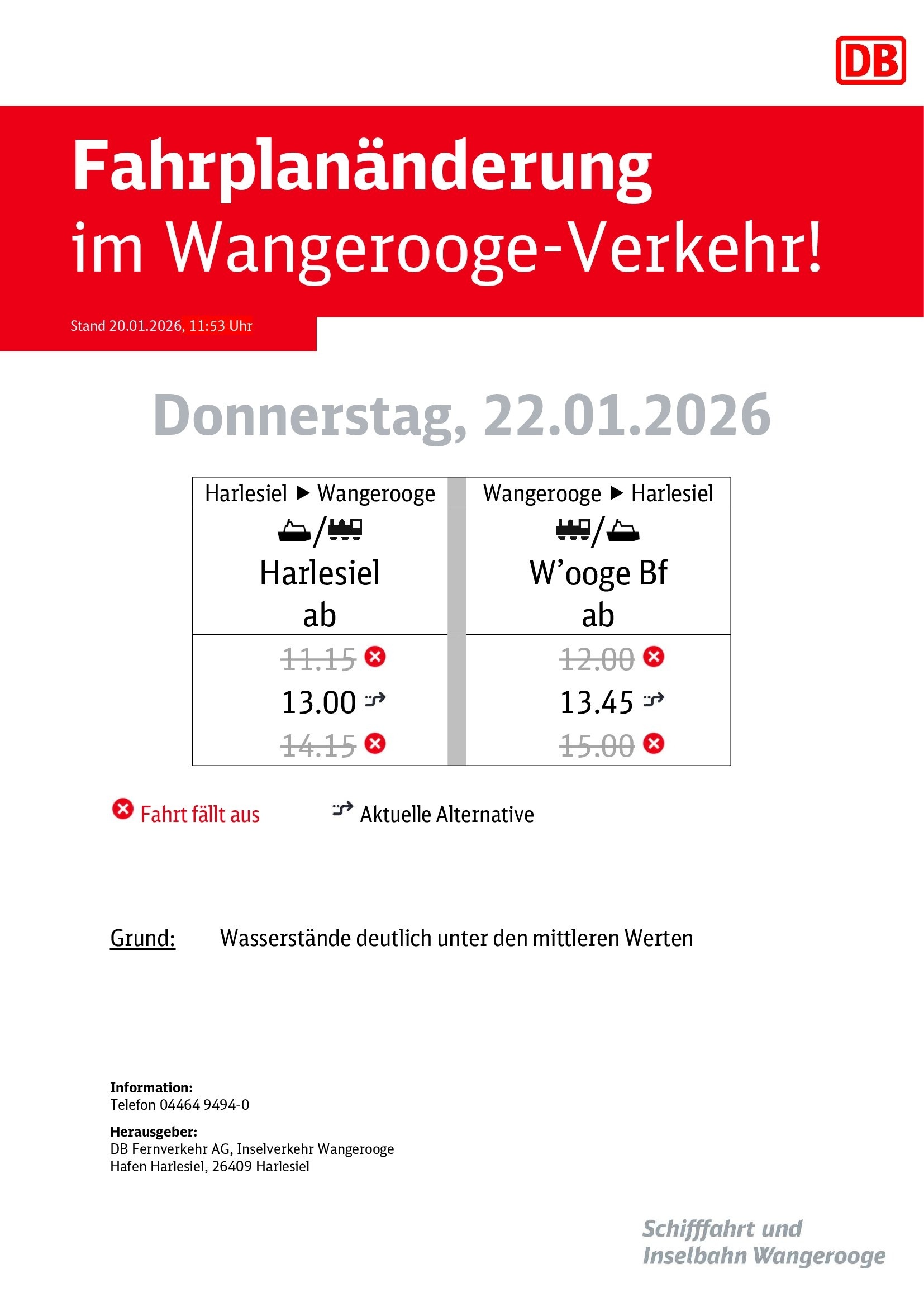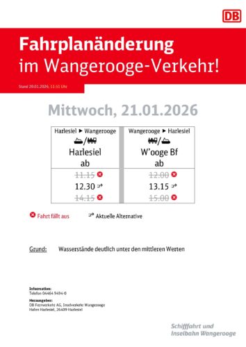 Aufgrund gemeldeter Wasserstände, die deutlich unter den mittleren Werten liegen werden, kommt es vom morgigen Mittwoch, den 21.01.2026 bis einschließlich Samstag, den 24.01.2026 zu Fahrplanänderungen im Verkehr von und nach Wangerooge