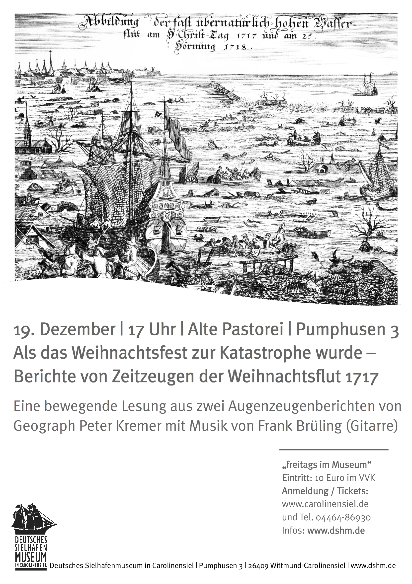 Lesung mit Musik zur Weihnachtsflut 1717 Im Rahmen seiner Veranstaltungsreihe „freitags im Museum“ bietet das Deutsche Sielhafenmuseum in Carolinensiel am […] -