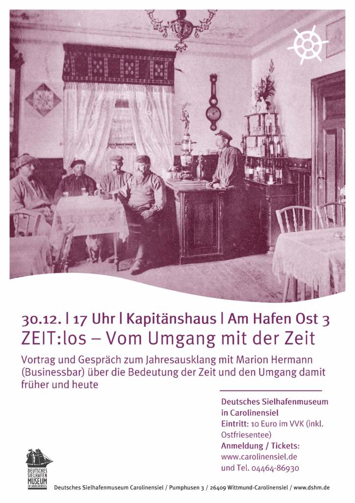 „Wer gezwungen ist, dem Tag das Notwendigste abzujagen, dem segelt das Schiff der Zeit meist mit beängstigender Hast durch die Stunden, …“ schreibt die Carolinensieler Schriftstellerin Marie Ulfers in ihrem 1949 erschienen Roman „Windiger Siel“. Gilt dieser Spruch auch heute in unserer scheinbar rastlosen Zeit? Dieser Frage geht die Qualitätsmanagerin und Achtsamkeitstrainerin Marion Hermann (Businessbar) am Silvestervortag, am Dienstag, den 30. Dezember um 17 Uhr in der Schifferkneipe des Kapitänshauses…