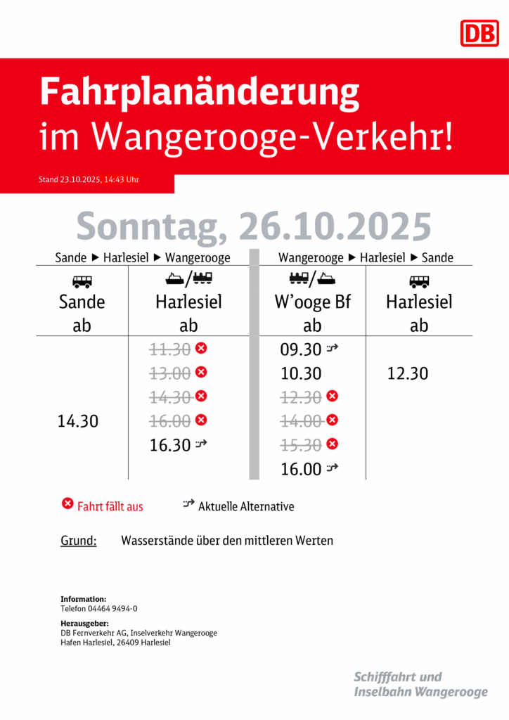 Ab dem 1. November 2025 werden die für die saisonale Abfuhr angemeldeten Rest- und Biosaisontonnen nicht mehr geleert. Darauf weist die Abfallwirtschaft des Landkreises Wittmund hin. Noch bis Ende des laufenden Monats Oktober werden diese Tonnen im 14-täglichen Rhythmus abgefahren. Die neue Saison startet erst wieder im April kommenden Jahres, also zum 2. Quartal 2026. Lediglich die Saisontonnen, die normalerweise am 31.10. geleert werden würden, werden aufgrund der Feiertagsverschiebung (Reformationstag)…