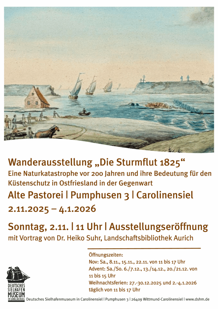 Vortrag von Dr. Heiko Suhr und Eröffnung der Wanderausstellung im Deutschen Sielhafenmuseum Das Deutsche Sielhafenmuseum in Carolinensiel zeigt in den Wintermonaten vom 2.11.2025 bis zum 4.1.2026 eine Ausstellung zur Sturmflut 1825, die von der Ostfriesischen Landschaft und den ostfriesischen Deichverbänden gemeinsam erarbeitet wurde. Der Leiter der Landschaftsbibliothek Dr. Heiko Suhr eröffnet die Ausstellung am Sonntag, 2.11. um 11 Uhr in der Alten Pastorei mit einem Vortrag über die Naturkatastrophe vor…
