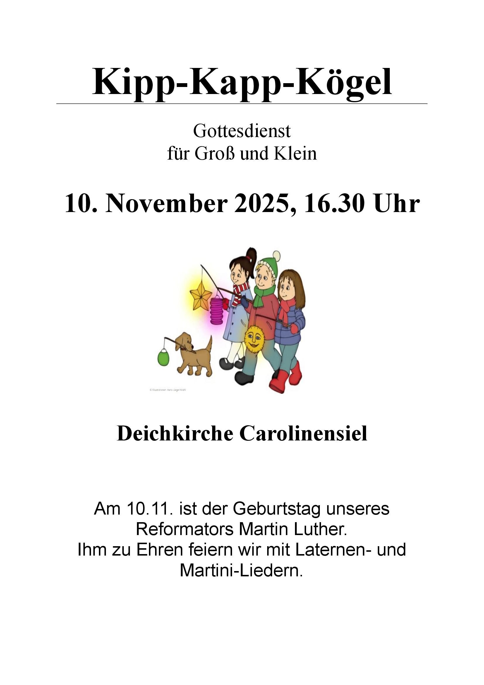 Am Montag, dem 10. November findet um 16.30 Uhr in der Deichkirche Carolinensiel ein Kipp-Kapp-Kögel-Gottesdienst für Groß- und Klein in Hoch- und Plattdeutsch mit den Lektoren Jan-Peter Kuhn und Elke Götz statt. Es sollen Martini-Lieder gesungen und an Martin Luther gedacht werden. Laternen dürfen gerne mitgebracht werden. Anschließend ziehen die Kinder wieder mit ihren Laternen durch den Ort.