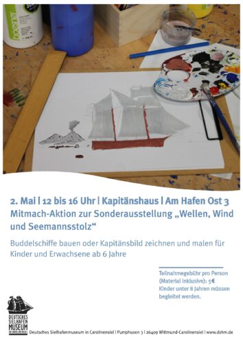In zwei Museumsgebäuden zeigt das Deutsche Sielhafenmuseum zur Zeit die Sonderausstellung „Wellen, Wind und Seemannsstolz – Schiffsdioramen und Kapitänsbilder des 19. Jahrhunderts“. Voller Stolz schnitzten die Seeleute in den Wintermonaten ein Modell ihres eigenen Segelschiffes und bauten es in eine tolle Landschaft mit Meer und Himmel in einer Kiste oder einer Flasche. Von Marinemalern ließen sich die Kapitäne ein Porträt ihres Schiffes malen und hängten es über das Wohnzimmerzimmersofa. Wir wollen es ihnen nachmachen und mit Papier, Pappe, Kleister und Farbe auch ein „Buddelschiff“ bauen oder ein Schiffsporträt auf Leinwand malen. Die Museumsmitarbeiter laden Kinder und Erwachsene am Samstag, den 2. Mai von 12 bis 16 Uhr in das Kapitänshaus des Deutschen Sielhafenmuseums in Carolinensiel zu dieser besonderen Mitmachaktion ein. Weitere Informationen unter www.dshm.de/programm/.